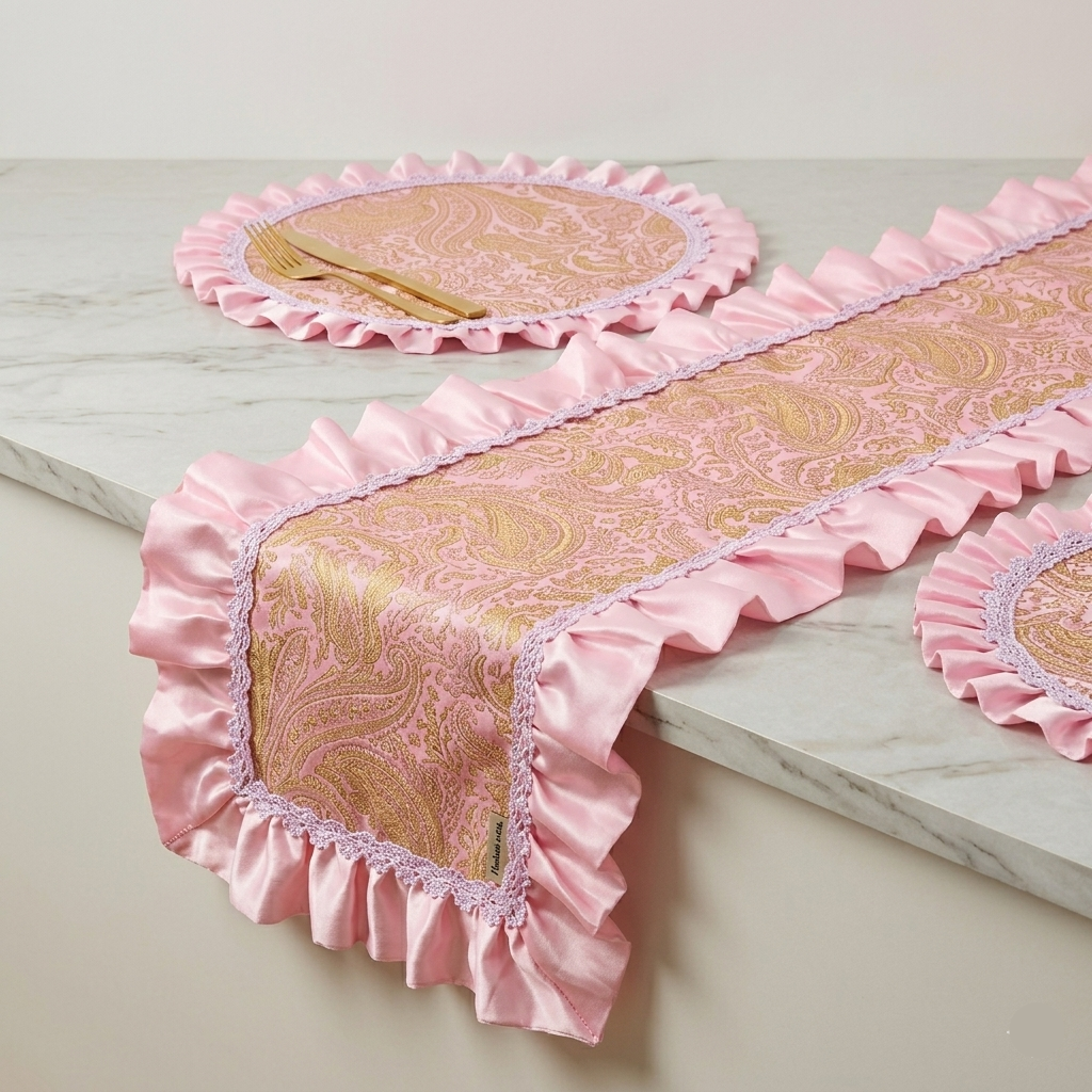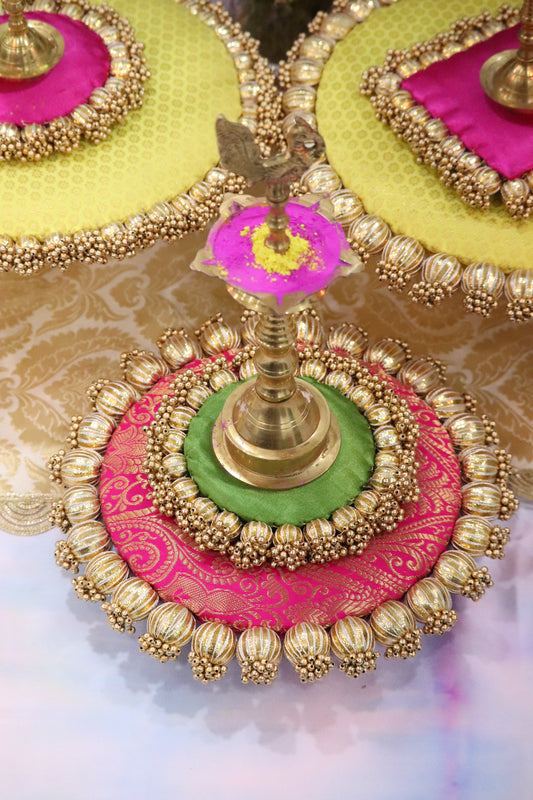 Sunny Blooms – Yellow & Pink Placemat Set with Brass Stands | Festive Indian Table Decor | Pooja Thali & Mandir Styling Set | Vibrant Floral Theme Setup