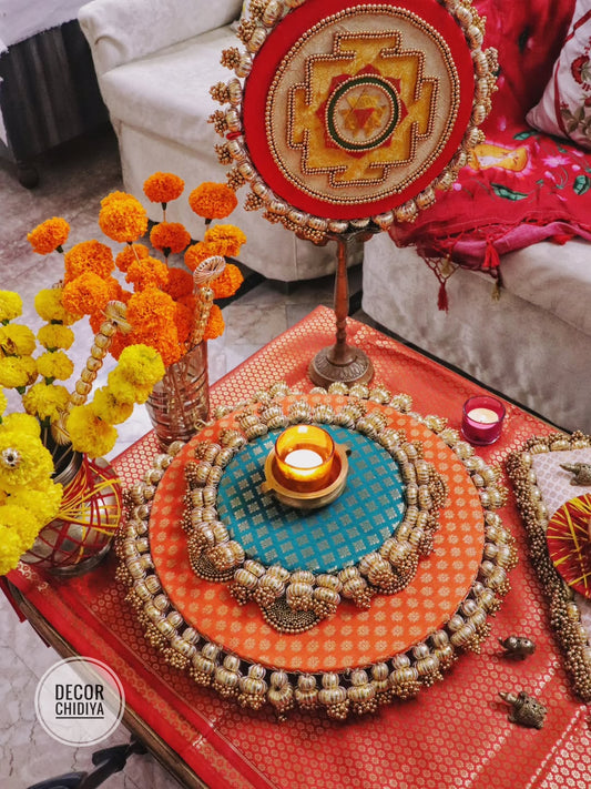 Shree Yantra Glow Brass Pooja & Festive Table Decor Set – Traditional Indian Home Styling